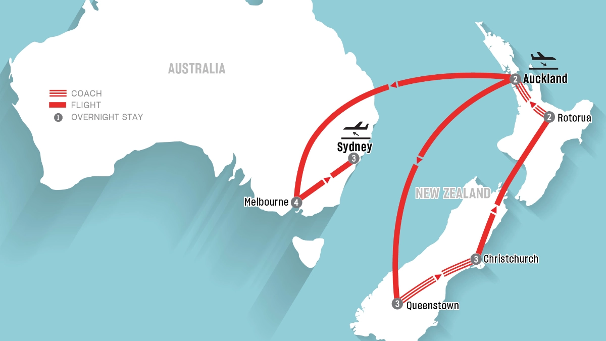 - Domestic flights: Auckland to Queenstown, Christchurch to Rotorua, Auckland to Melbourne, Melbourne to Sydney