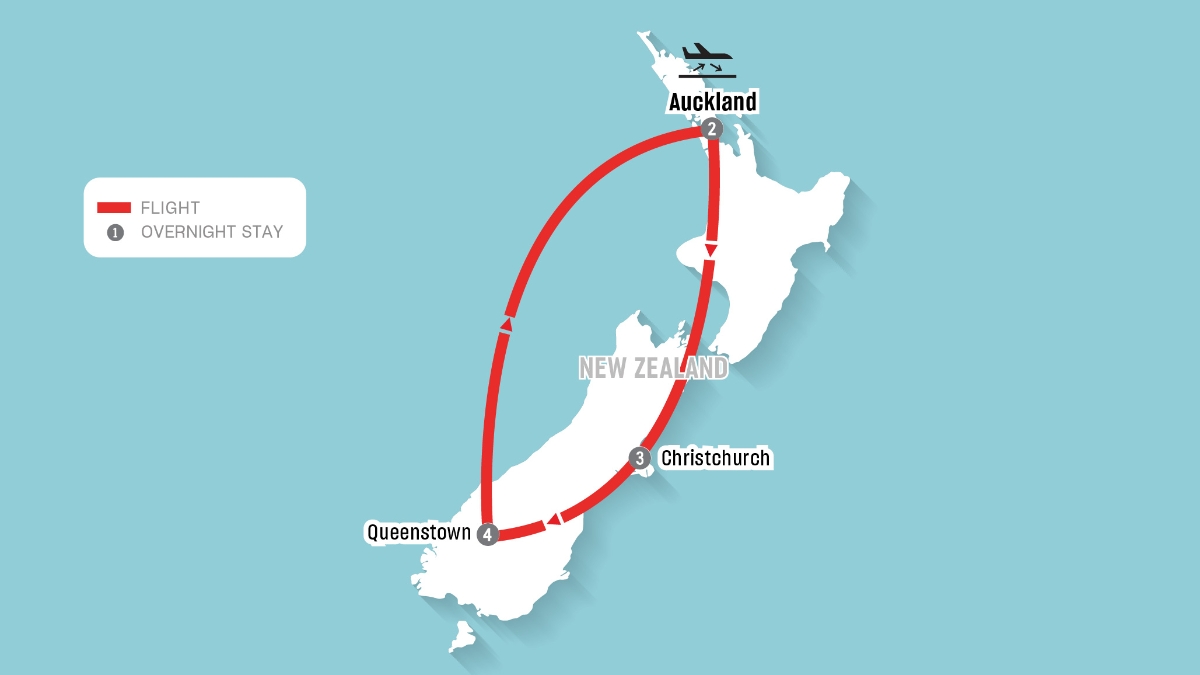 - Domestic flights: Auckland to Christchurch, Christchurch to Queenstown, Queenstown to Auckland