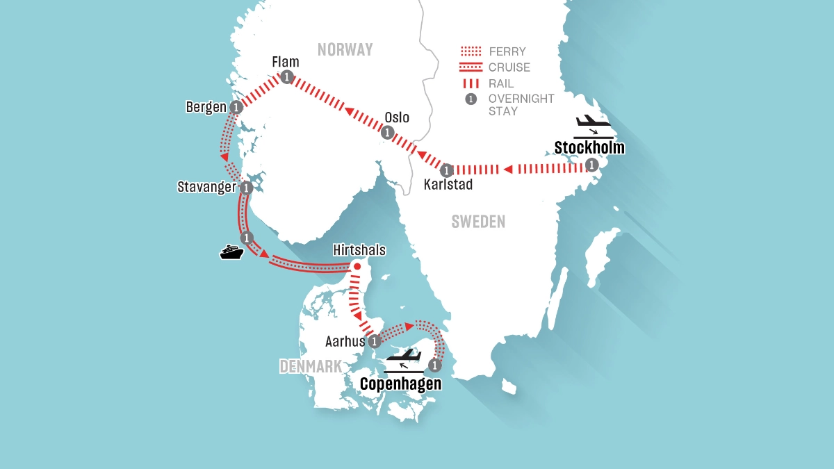 Experience the best of Scandinavia on this 11-day, 9-night adventure. This independent, self-guided itinerary takes you from Stockholm’s historic waterways to the majestic fjords of Norway and the modern charm of Copenhagen. Travel by train, boat and ferry through stunning landscapes and vibrant cities, enjoying the best of three countries combined into one amazing Nordic experience.