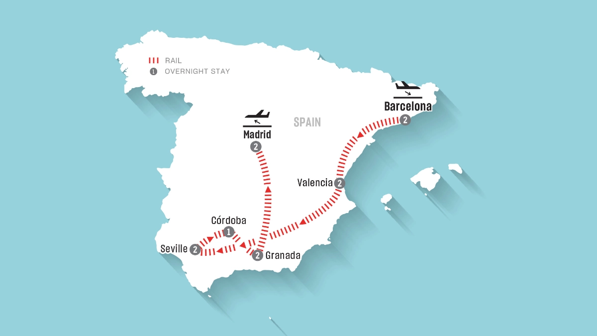This ‘Best of Spain" itinerary takes you through some of the country’s most iconic and culturally rich cities — Barcelona, Valencia, Granada, Córdoba and Madrid. This route combines coastal charm, Moorish architecture, vibrant nightlife and world-class museums.