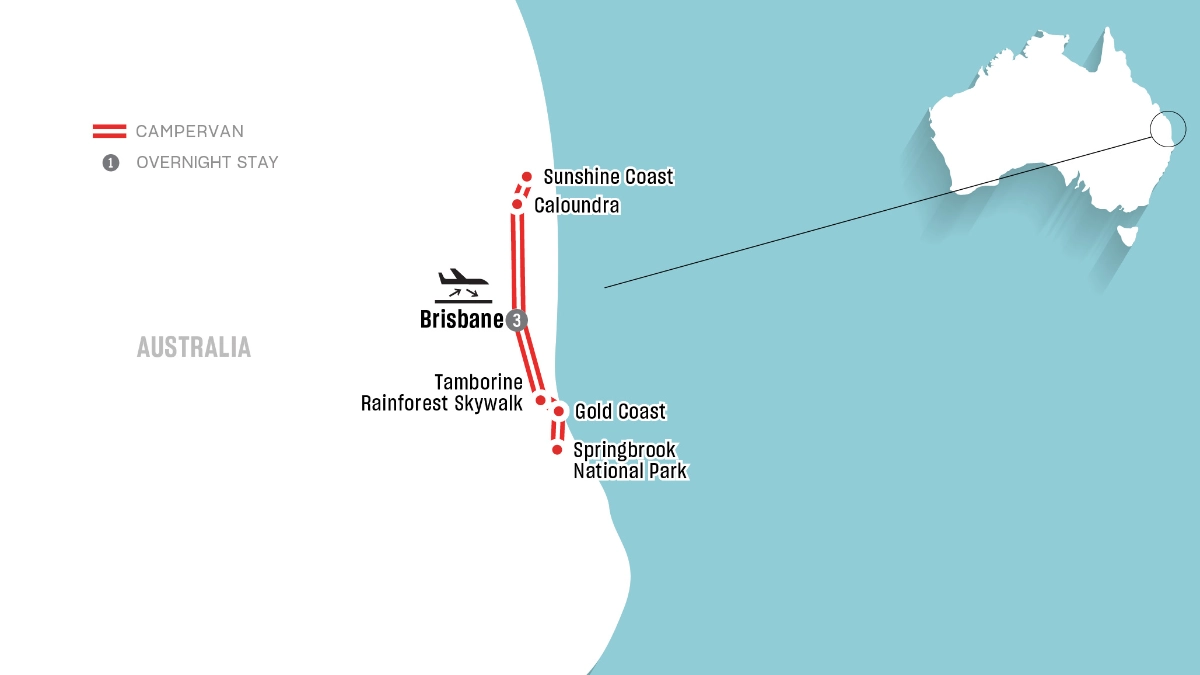 You’ll travel north through the laid-back Sunshine Coast before heading south to the Gold Coast, where sun-kissed beaches meet lively cities. From there, you’ll journey inland to discover the serene beauty of Curtis Falls and the enchanting Tamborine Rainforest before immersing yourself in the pristine wilderness of Binna Burra, Springbrook National Park and Lamington National Park.