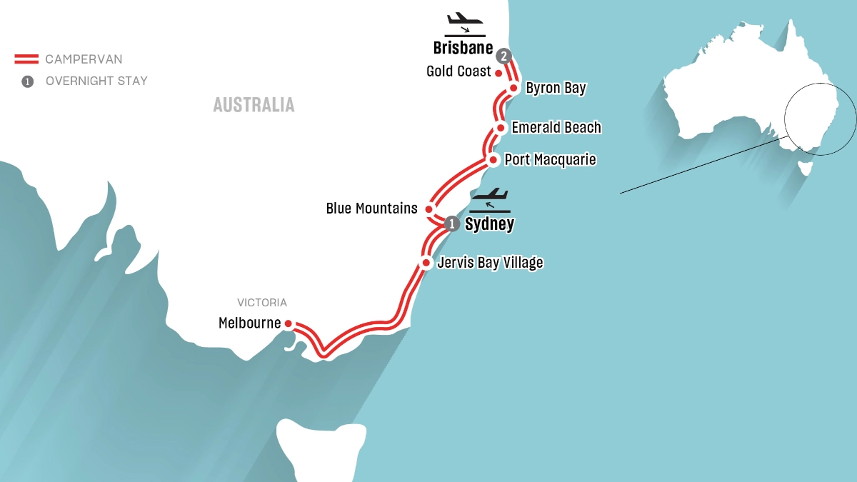Embark on the ultimate Aussie road trip as you drive through Australia in a campervan.  Your journey starts in Brisbane, where you’ll have a couple of days to take in the sights before taking the wheel and exploring Sydney through to Melbourne—3 of Australia's most iconic East Coast cities connected by a spectacular blend of beaches, bushland and vibrant regional towns. This route offers the perfect mix of coastal relaxation, cultural exploration and scenic countryside driving.