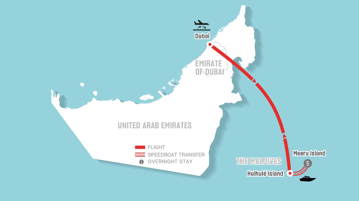 After breakfast, meet a local representative in the lobby of your hotel, who will escort you to the boat launch to take the speedboat back to Velana International Airport on Hulhulé Island to catch your flight to Dubai.