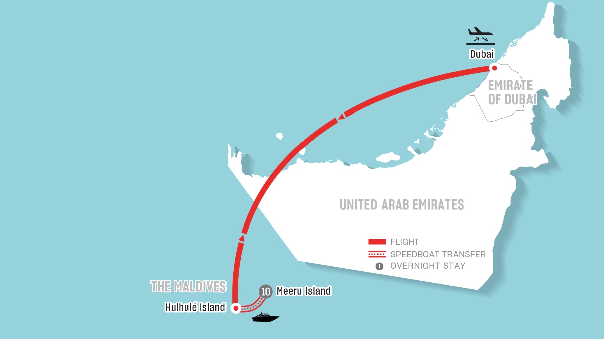 After breakfast, meet a local representative in the lobby of your hotel, who will escort you to the boat launch to take the speedboat back to Velana International Airport on Hulhulé Island to catch your flight to Dubai.