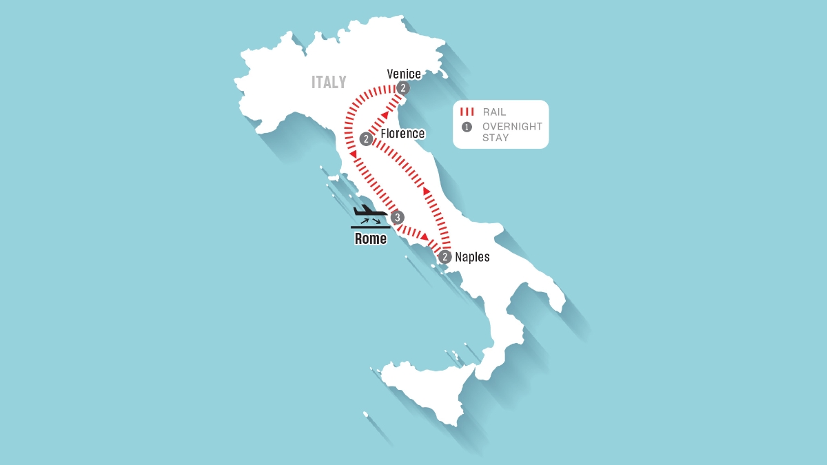 - High-speed train from Rome to Naples, Naples to Florence, Florence to Venice and Venice to Rome in the selected class of service