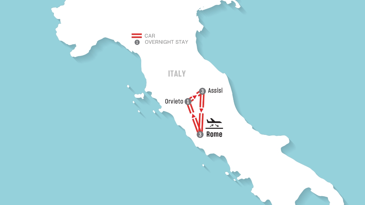 Discover the timeless beauty of central Italy on this journey through Lazio and Umbria. Begin in Rome before setting off by car to explore medieval hill towns, enchanting lakes and UNESCO World Heritage Sites along the way. With stops in Orvieto, Assisi and charming nearby villages, this itinerary combines history, culture, gastronomy and breathtaking landscapes for an unforgettable Italian experience.