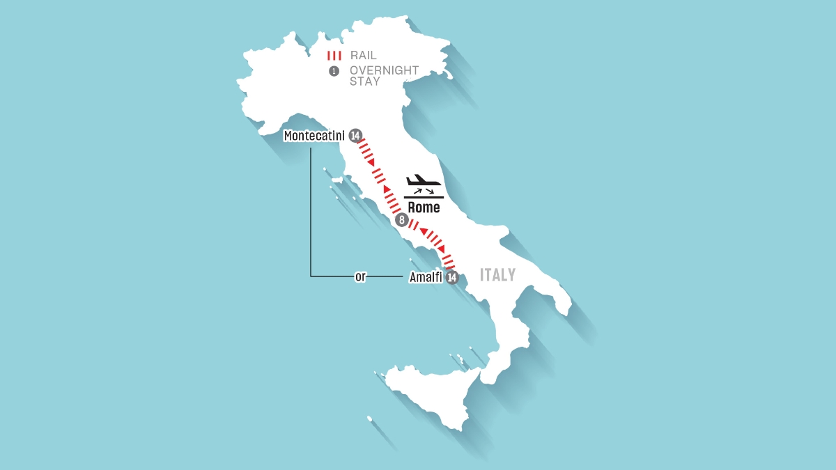 Experience the endless charms of Italy with this long stay destination hop itinerary, which combines the vibrant energy of Rome with your choice of a second destination. Spend a week in the Eternal City, followed by a 14-night stay in either the renowned spa town of Montecatini or along the picturesque Amalfi Coast—each offering its own unique history and beauty