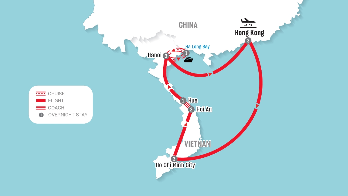 - 13 nights in Superior accommodation (3 nights in Ho Chi Ming City, 2 nights in Hoi An, 1 night in Hue, 2 nights in Hanoi, 1 night in Ha Long Bay, 1 night in Hanoi, 3 nights in Hong Kong)