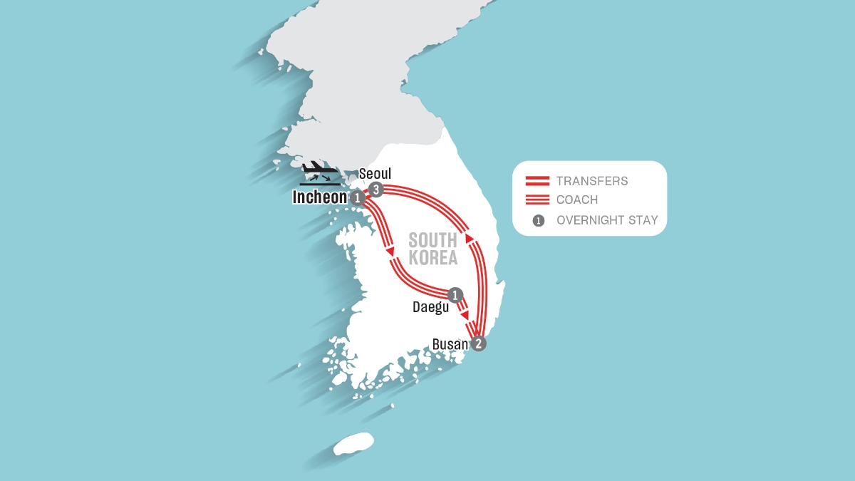 - 7 nights Superior accommodation with meal inclusions according to itinerary (1 nights in Incheon, 1 night in Daegu, 2 nights in Busan, 3 night in Seoul)