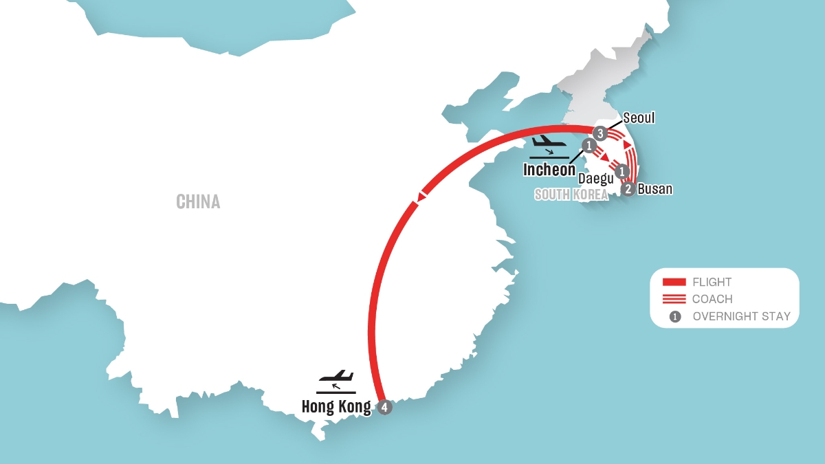 - Round-trip flight to Asia (if Flight & Hotel option is chosen), arriving in South Korea, and departing from Hong Kong