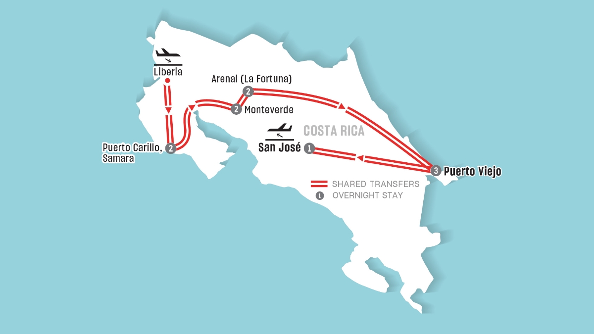 • 10 nights of accommodations (Sámara: 2 nights, Monteverde: 2 nights, Arenal: 2 nights, Puerto Viejo: 3 nights, San José: 1 night)