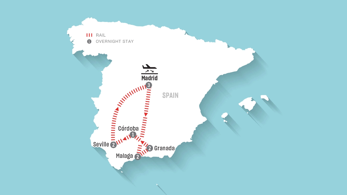 • High-speed AVE train ticket in selected class from: Madrid - Málaga, Málaga - Granada, Granada - Córdoba, Córdoba - Seville, Seville - Madrid (Málaga to Granada is via regional train)