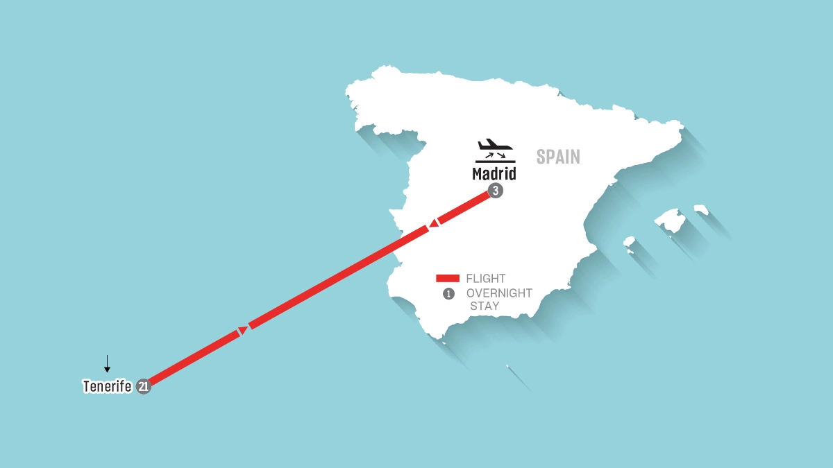 • 24 nights of accommodation in selected category, 3 Nights in Madrid & 21 Nights in Tenerife  (1nts Madrid - 21nts Tenerife - 2nts Madrid)
