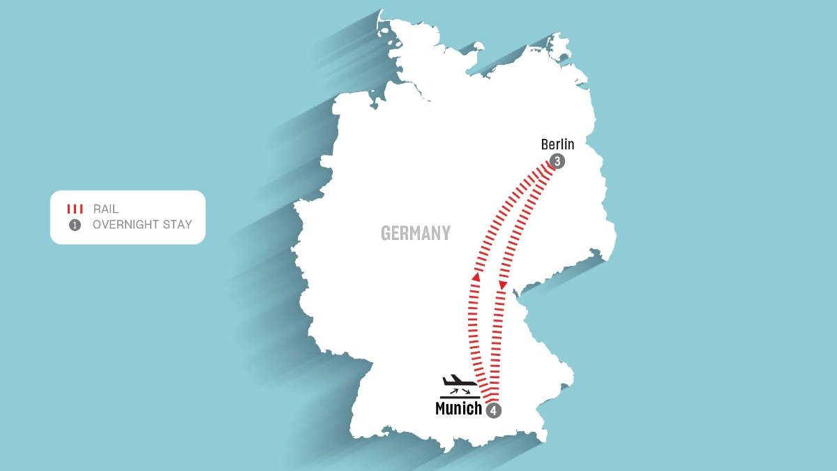 • Train tickets round-trip Economy Class, including seat reservation, Munich – Berlin – Munich