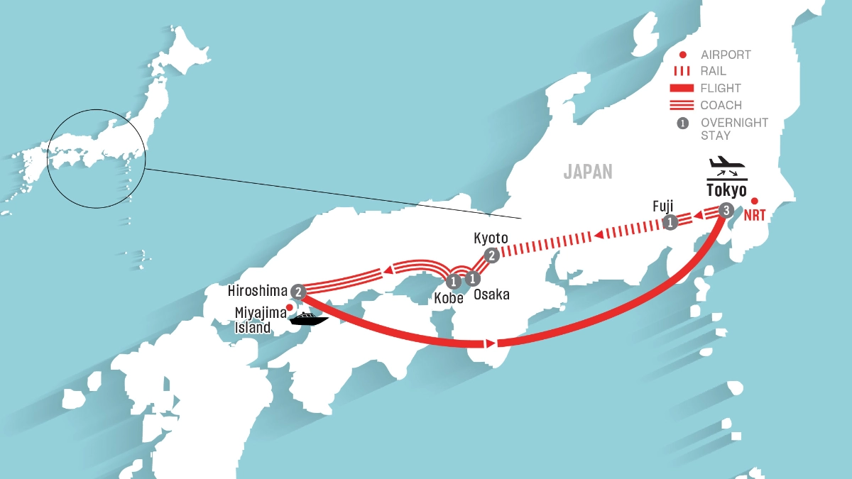 - 10 nights accommodation in Superior Accommodation (3 nights in Tokyo, 1 night in Fuji, 2 nights in Kyoto, 1 night in Osaka, 1 night in Kobe, 2 nights in Hiroshima