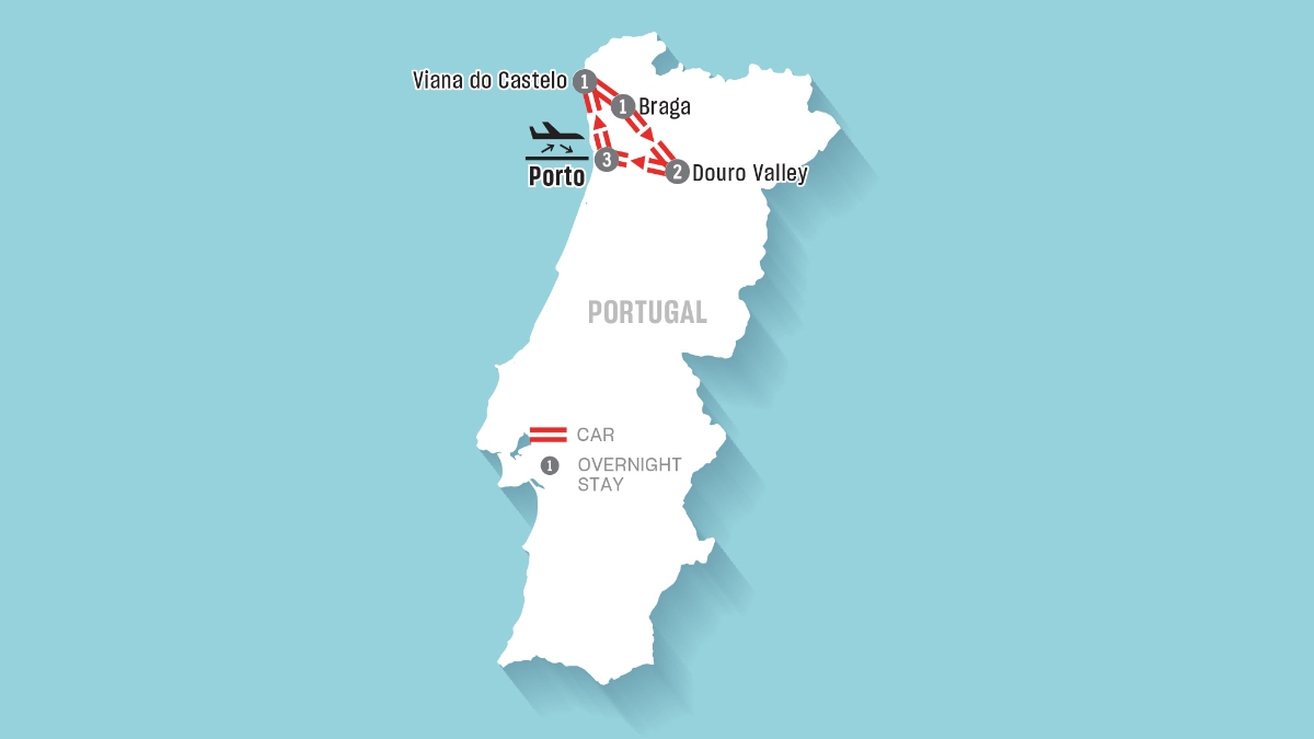 Discover the highlights of Northern Portugal on this 7-night tour, with visits to historic centres like Porto and Guimarães, the Vale do Coa archaeological sites and the picturesque Douro Valley.