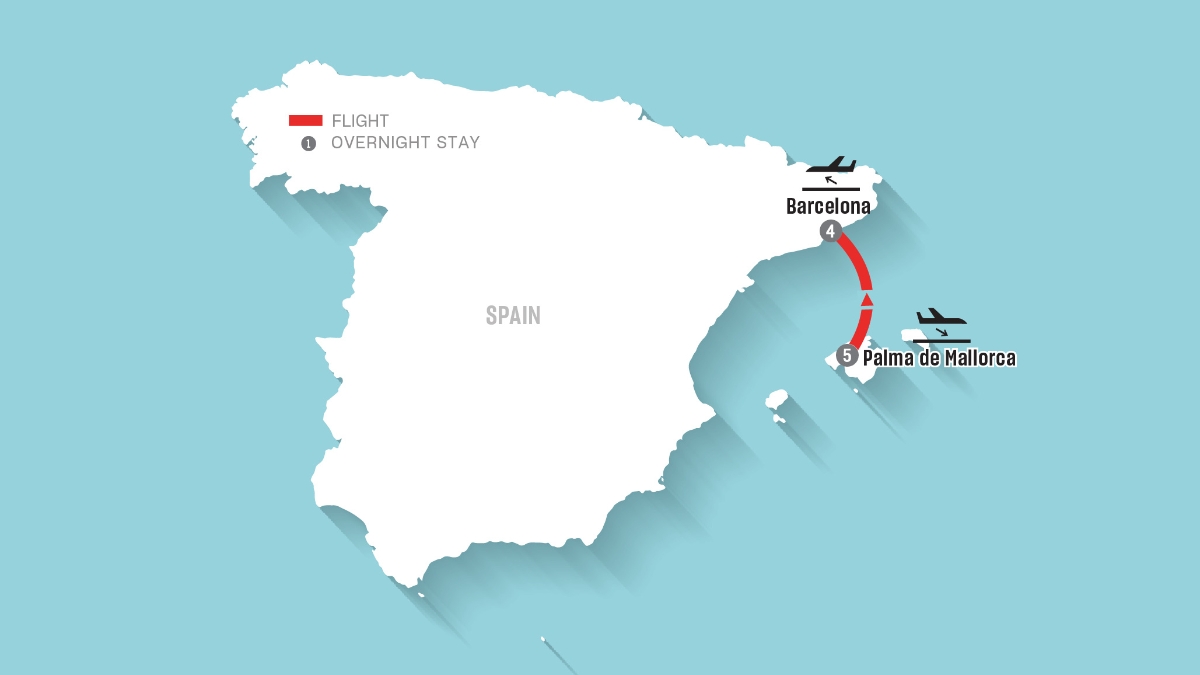 After breakfast, take a private transfer to Palma airport for your domestic flight to Barcelona.