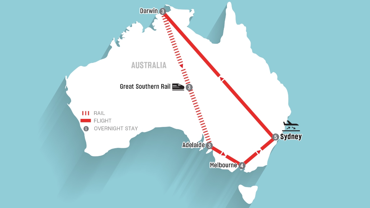 - Domestic flight from Sydney to Darwin / Adelaide to Melbourne / Melbourne to Sydney