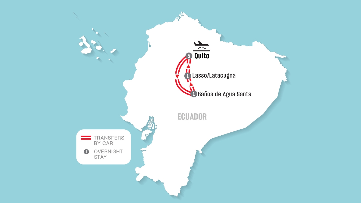 - 7 nights accommodation in select category (5 nights in Quito, 1 night in Baños de Agua Santa, 1 night in Latacunga/Lasso)