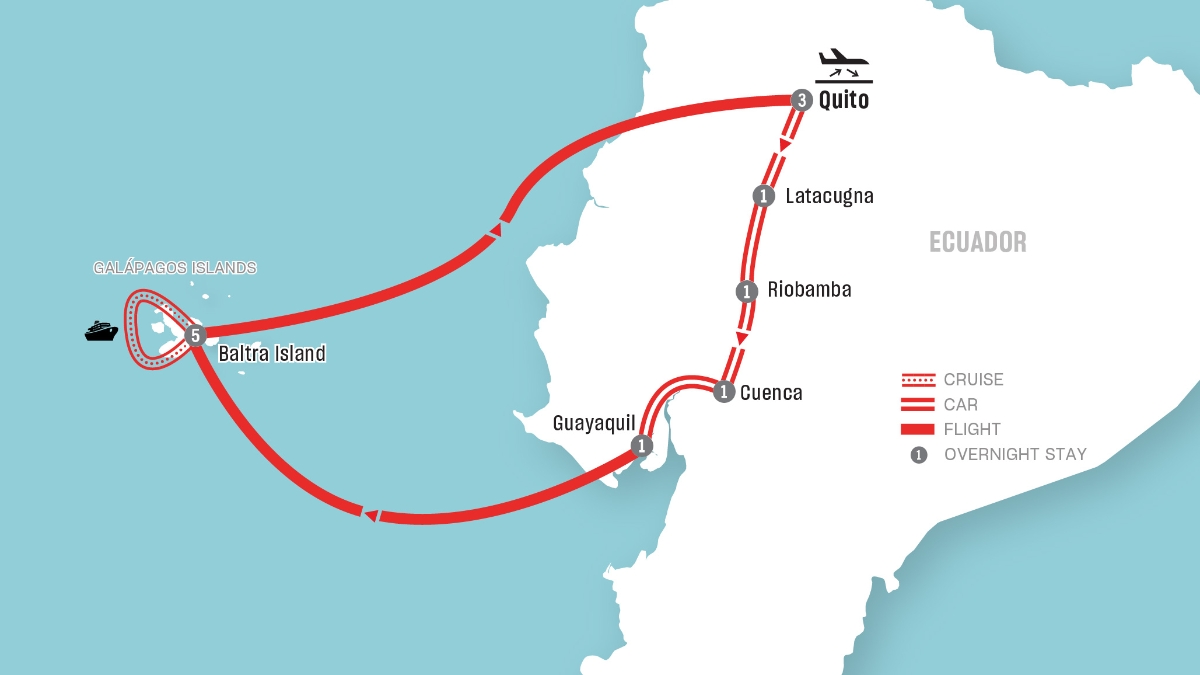 - 12 nights accommodation in select category (3 nights in Quito, 1 night in Latacunga, 1 night in Riobamba, 1 night in Cuenca, 1 night in Guayaquil, 5 nights in Galápagos cruise)