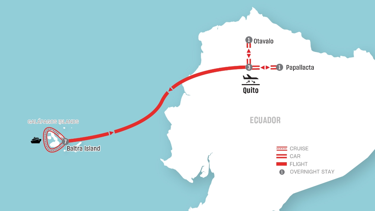 - 12 nights Premium accommodation in select category (3 nights in Quito, 1 night in Otavalo, 7 nights in Galápagos cruise, 1 night in Papallacta)