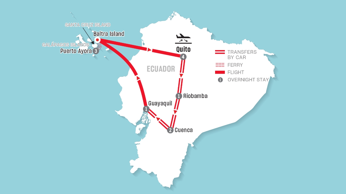 - One-way flight in economy class from Guayaquil to Baltra airport, and from Baltra Island to Quito