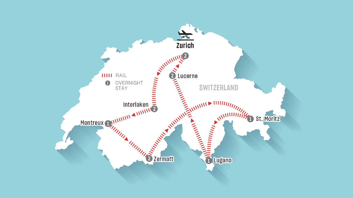 15-Day Swiss Travel Pass in 1st class: covers unlimited travel by train, bus and boat throughout the itinerary.