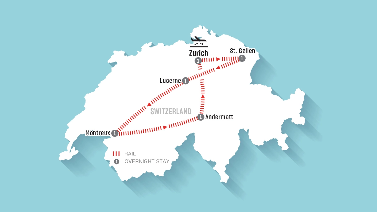 Discover the charm and diversity of Switzerland on this 7-day journey through St. Gallen, Lucerne, Montreux and Andermatt. From historic abbeys and lakeside promenades to panoramic mountain vistas and scenic train rides, this itinerary blends culture, nature and relaxation for an unforgettable Swiss experience.
