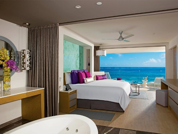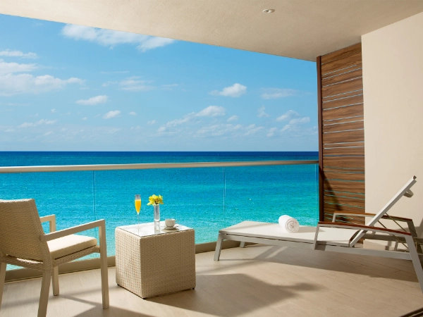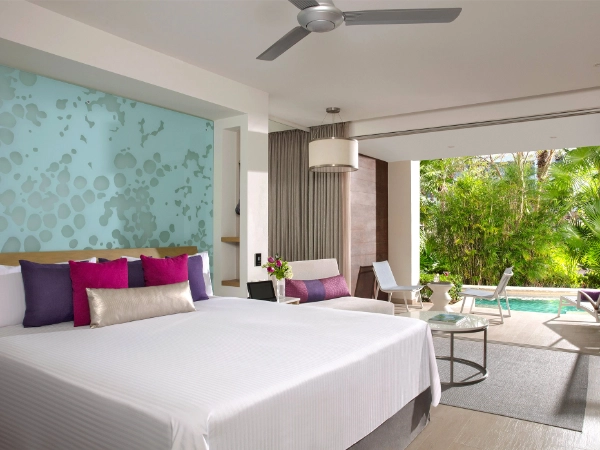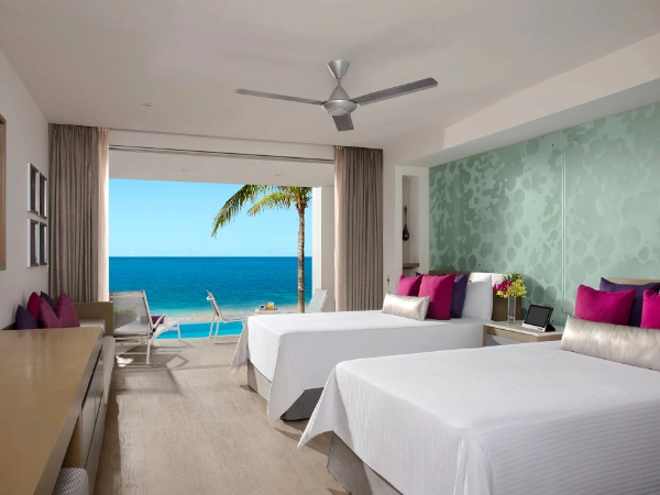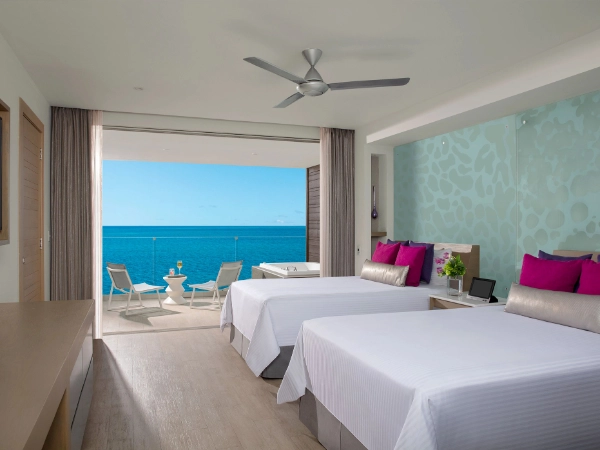 Suite junior Xhale Club avec vue sur la mer, lits deux places et accès direct à la piscine
