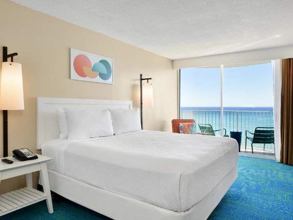 Chambre avec très grand lit et vue partielle sur la mer