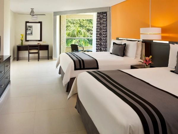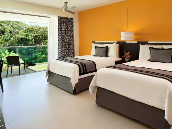 Chambre de luxe avec vue tropicale, baignoire à remous et lits deux places