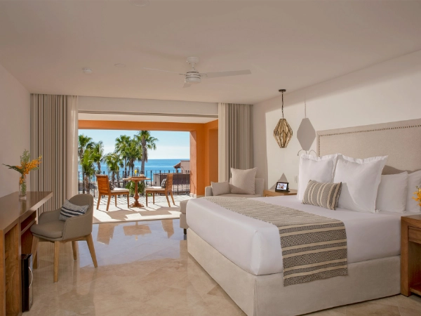Suite de luxe avec très grand lit et vue partielle sur la mer