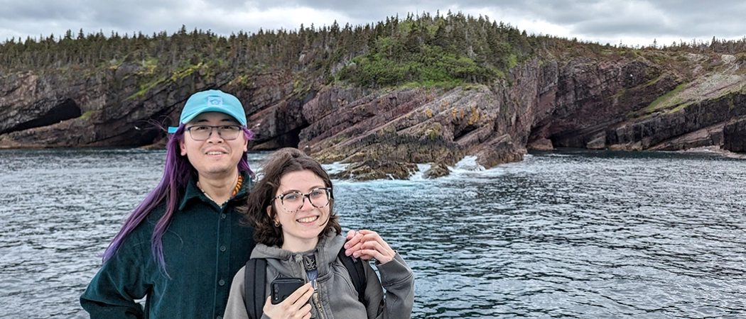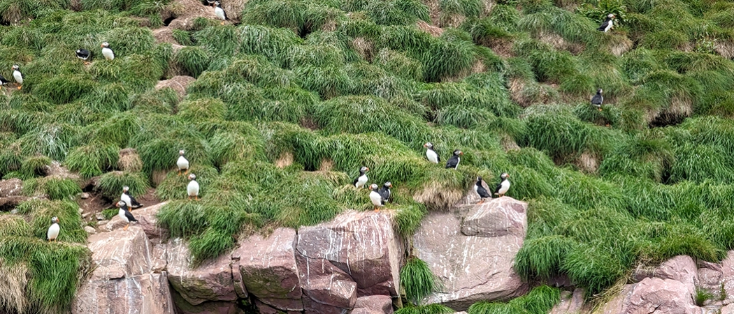 Le lendemain, nous nous sommes dirigé·es au sud jusqu’à Bay Bulls pour notre excursion d’observation des baleines. Le bateau vous emmène sur l’île Gull, qui est absolument couverte d’oiseaux. Nous avons vu des macareux nicher (ils sont beaucoup plus petits qu’on ne le pense), et probablement un million de petits pingouins et de guillemots marmettes le long des falaises.