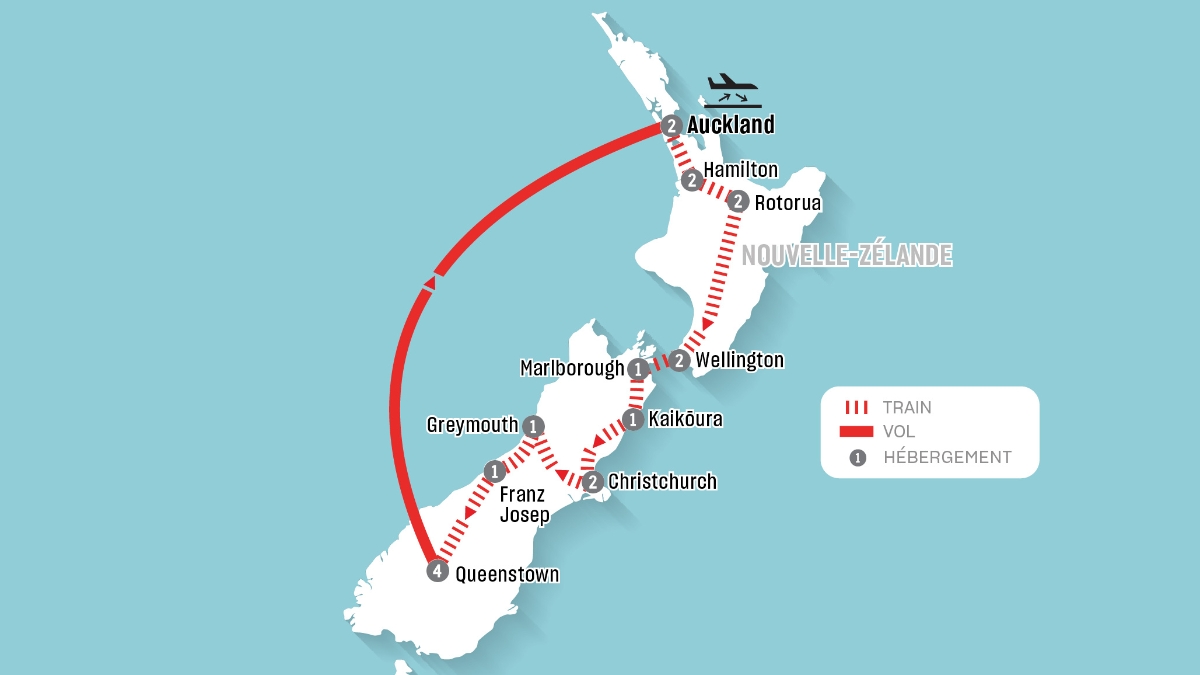 Vous voyagerez à bord des célèbres trains panoramiques de Nouvelle-Zélande, notamment le Northern Explorer, le Coastal Pacific et l’époustouflant TranzAlpine, tout en profitant d’excursions guidées par des experts, d’hébergements de charme et d’une cuisine d’inspiration locale. En chemin, découvrez les villes animées d’Auckland, Wellington et Christchurch, les petites villes charmantes de Kaikōura et Franz Josef ainsi que des merveilles naturelles, comme les vallées géothermiques de Rotorua, les Alpes du Sud, le majestueux Milford Sound et Queenstown.