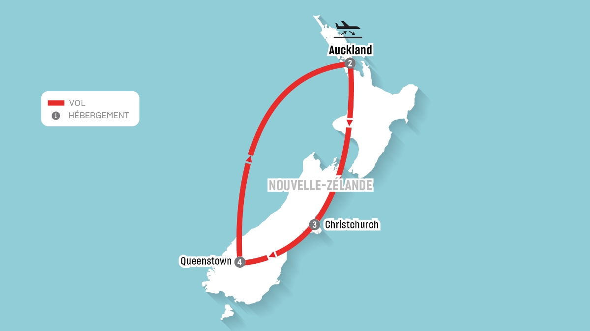 - Vol intérieur d'Auckland à Christchurch, de Christchurch à Queenstown et de Queenstown à Auckland