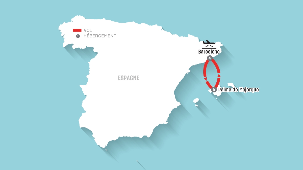 - 9 nuits d’hébergement dans la catégorie sélectionnée (4 nuits à Barcelone et 5 nuits à Majorque)