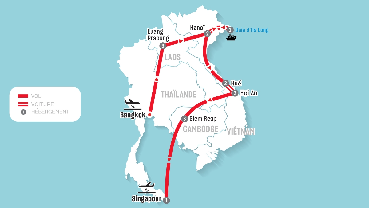 - Vol : Bangkok et Luang Prabang, Luang Prabang et Hanoï, Hanoï et Hue, Da Nang et Siem Reap, Siem Reap et Singapour