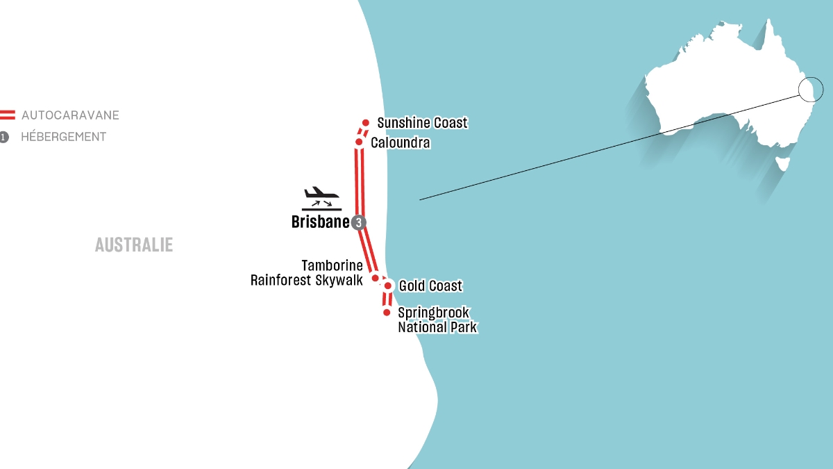 Vous voyagerez vers le nord à travers la Sunshine Coast, région décontractée, avant de vous diriger vers le sud jusqu’à la Gold Coast, où les plages ensoleillées côtoient des villes animées. De là, vous voyagerez vers l’intérieur des terres pour découvrir la beauté des chutes Curtis et la forêt tropicale féérique de Tamborine, avant de vous immerger dans la nature sauvage et préservée de Binna Burra, du parc national de Springbrook et du parc national de Lamington.
