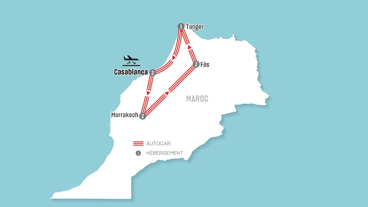 Découvrez le meilleur du Maroc au cours de ce voyage de 9 jours, des rues animées de Casablanca et Marrakech à la médina historique de Fès, en passant par la pittoresque ville bleue de Chefchaouen et le charme de la côte de Tanger. Profitez de visites guidées, de sites culturels incontournables et d’une cuisine authentique, tout en bénéficiant de temps libre pour visiter à votre rythme. Cet itinéraire combine histoire, culture et aventure pour une expérience marocaine inoubliable.