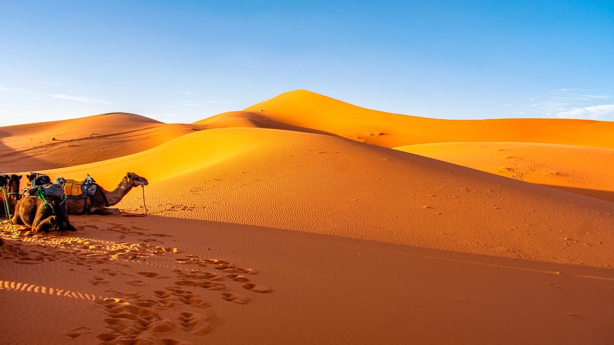 Après le petit-déjeuner, vous partirez pour Merzouga en passant par les spectaculaires gorges du Todra, un canyon impressionnant aux falaises calcaires vertigineuses et aux oasis luxuriantes. Vous continuerez votre visite à travers Erfoud, réputée pour ses dattes Medjool et ses fossiles préhistoriques, avant d’atteindre Merzouga. Vous serez transférés en 4 x 4 vers votre campement dans le désert, où vous pourrez profiter d’un souper sous les étoiles et passer la nuit dans un bivouac confortable avec sanitaires privés.