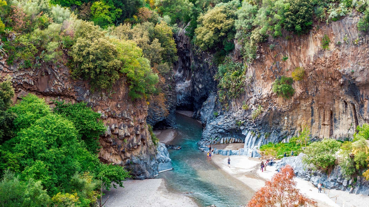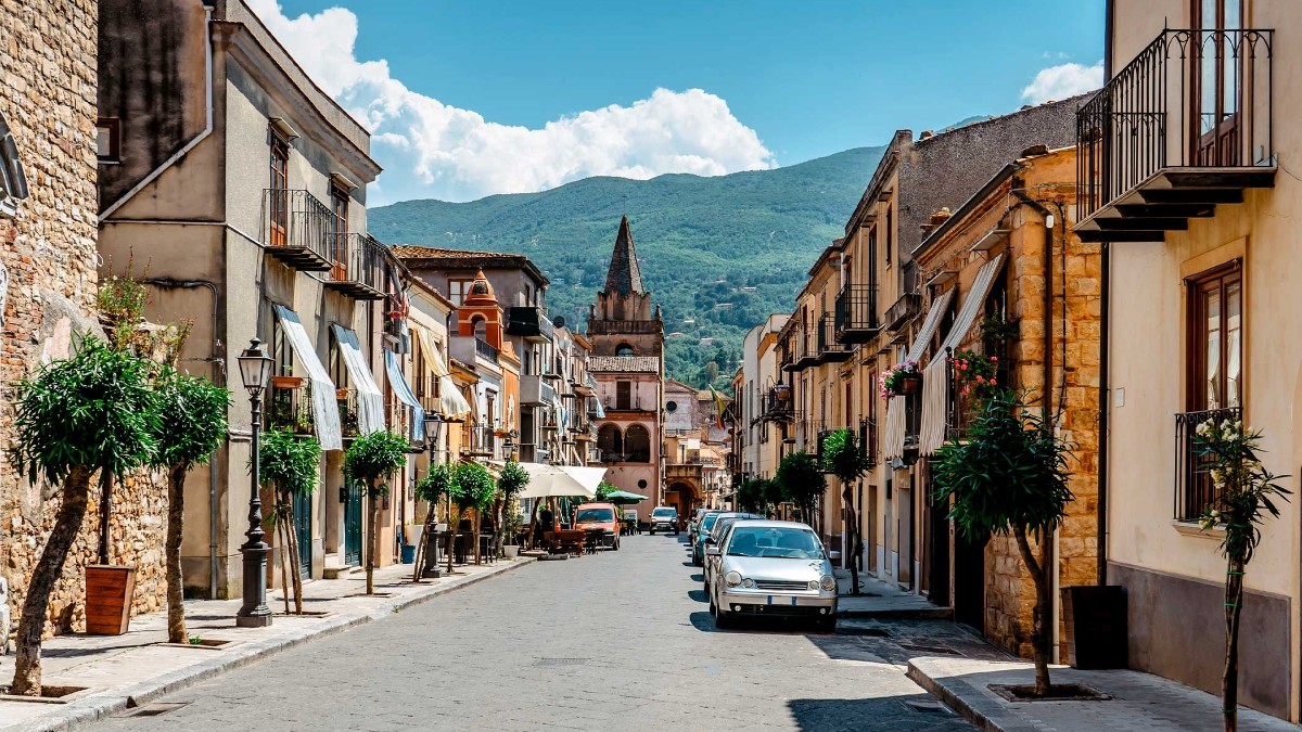 Poursuivez vers les gorges de l’Alcantara, un canyon sculpté par des coulées de lave aux impressionnantes formations basaltiques, puis rendez-vous à Motta Camastra, autre lieu de tournage de la série mafieuse.