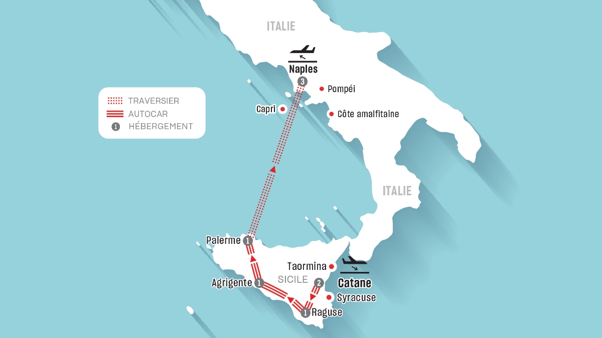 Cet itinéraire propose aux voyageurs une découverte de la richesse culturelle et naturelle de la Sicile, avant de poursuivre vers les joyaux emblématiques du sud de l’Italie. Entre sites archéologiques anciens, villages charmants, côtes pittoresques, dégustations de vins et vie urbaine animée, ce voyage réunit histoire, saveurs et paysages à couper le souffle. L’expérience se conclut à Naples avec la visite de sites mondialement connus et de merveilles côtières.