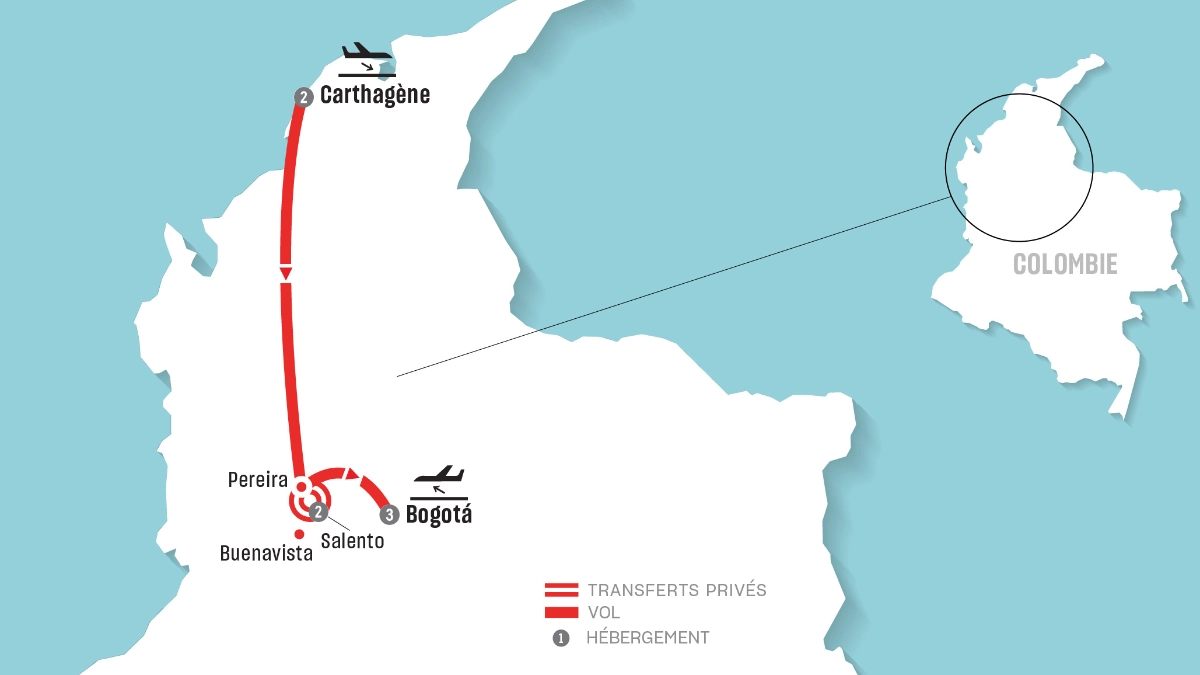 - 7 nuits d’hébergement supérieur (2 nuits à Cartagena de Indias, 2 nuits à Salento, 3 nuits à Bogotá)