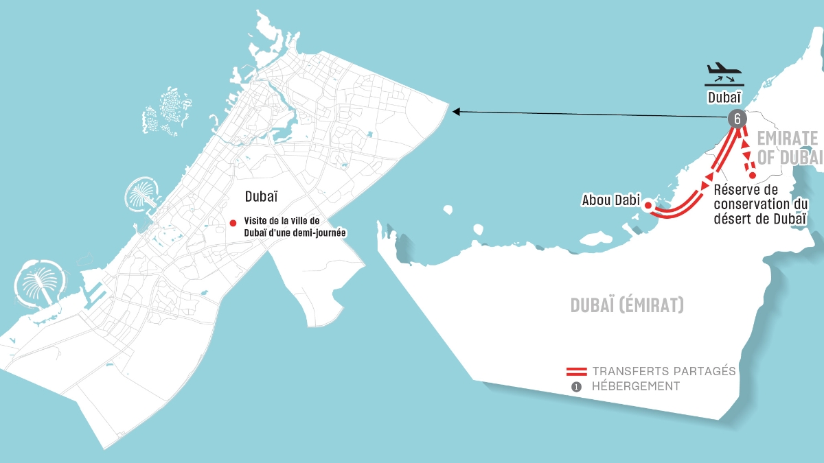 • 6 nuits d’hébergement dans la catégorie sélectionnée (4 nuits à Dubaï, 2 nuits à Abu Dhabi )