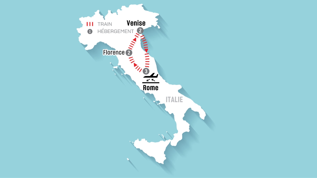 • Train à grande vitesse de Rome à Florence, de Florence à Venise et de Venise à Rome dans la classe de service sélectionnée