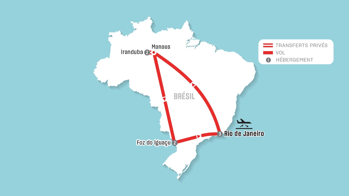 - 7 nuits d’hébergement (3 nuits à Rio de Janeiro, 2 nuits à Iranduba, 2 nuits à Foz do Iguaçu)