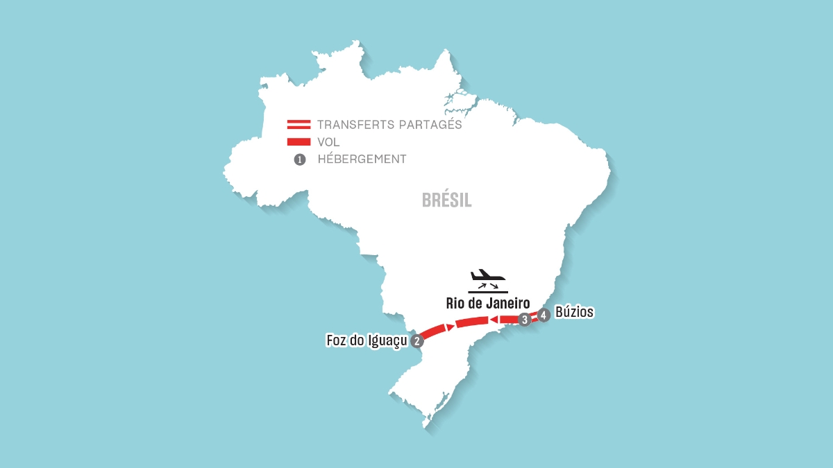 - 9 nuits d’hébergement (3 nuits à Rio de Janeiro, 2 nuits à Foz do Iguaçu et 4 nuits à Búzios)