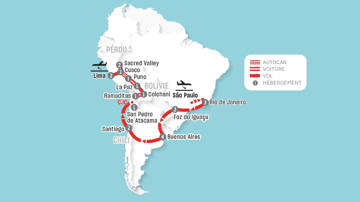 Avion : São Paulo et Rio de Janeiro, Rio de Janeiro et Foz do Iguaçu, Foz do Iguaçu et Buenos Aires, Buenos Aires et Santiago, Santiago et Calama, Calama et Uyuni, Uyuni et La Paz, La Paz et Cusco et entre Cusco et Lima