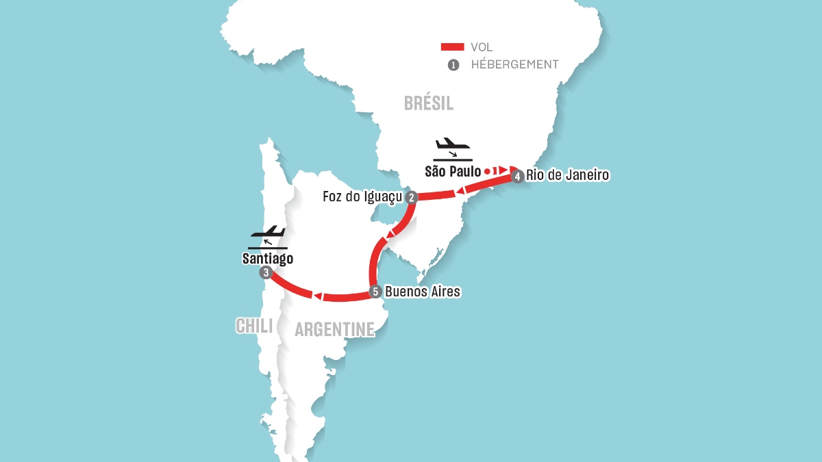 - Vols en aller simple en classe économique entre São Paulo et Rio de Janeiro, Rio de Janeiro et Foz do Iguaçu, Foz do Iguaçu et Buenos Aires et entre Buenos Aires et Santiago..