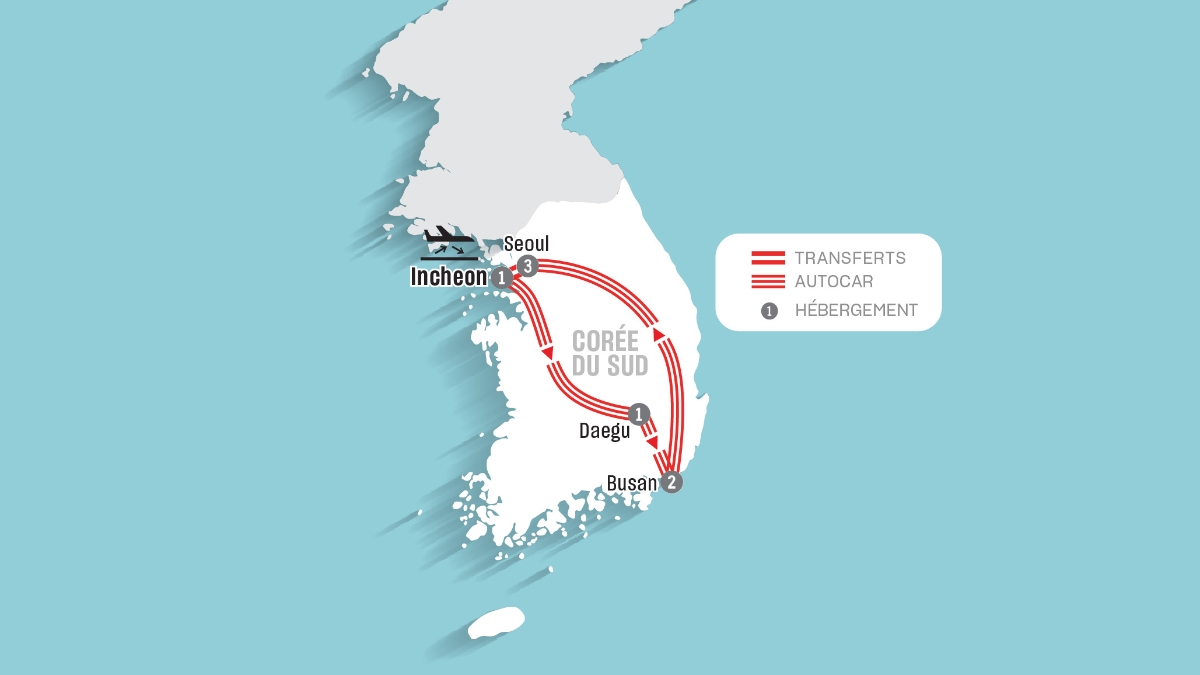 - 7 nuits d’hébergement supérieur avec repas inclus selon l’itinéraire (1 nuits à Incheon, 1 nuit à Daegu, 2 nuits à Busan, 3 nuit à Séoul)